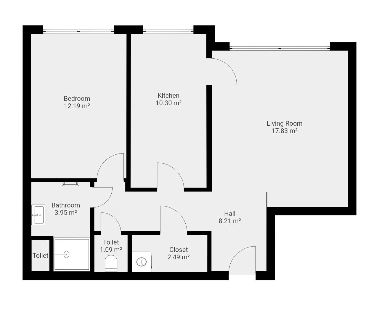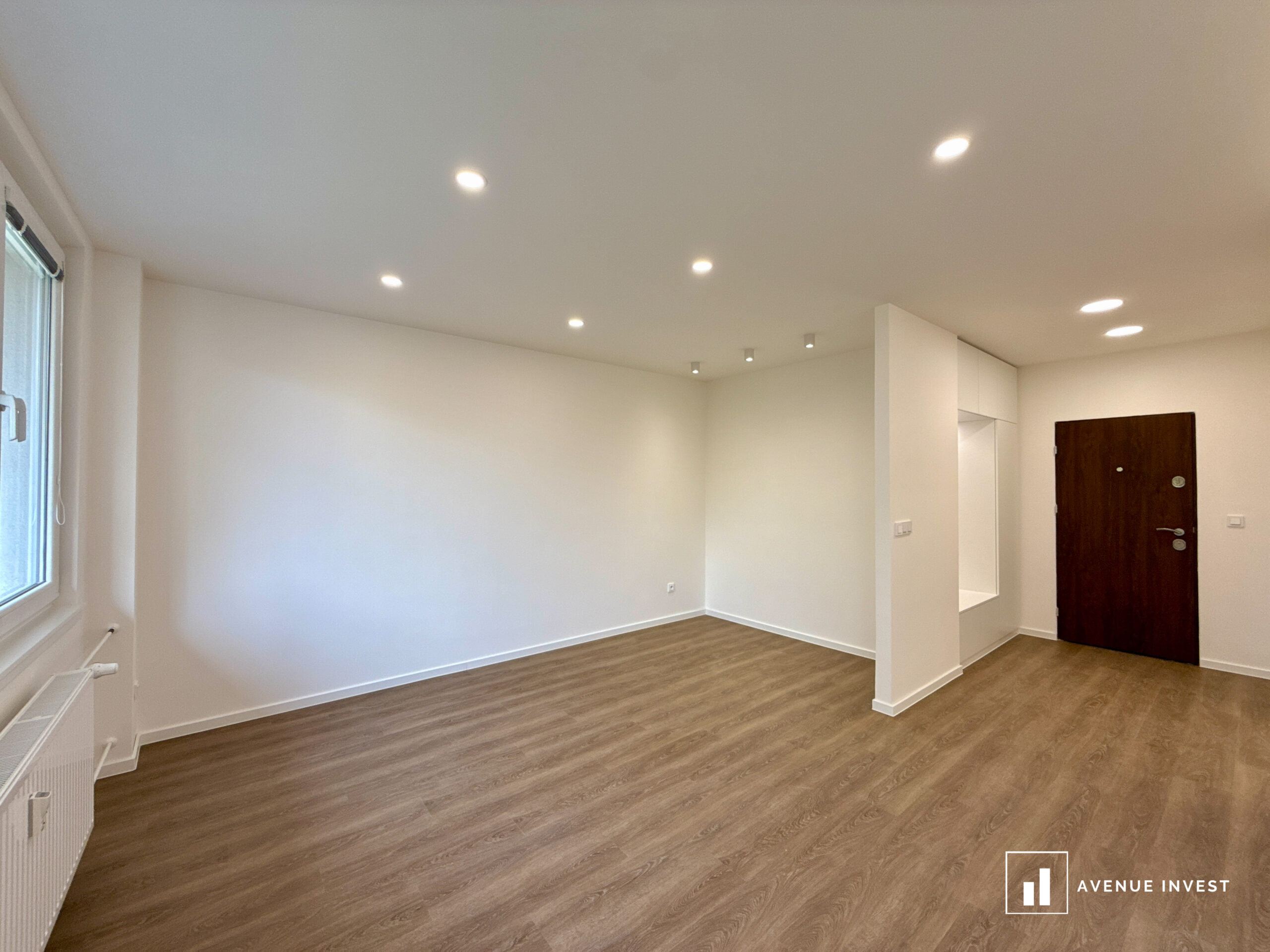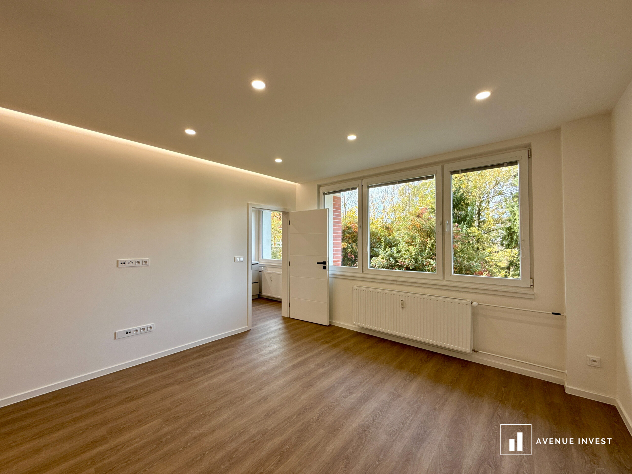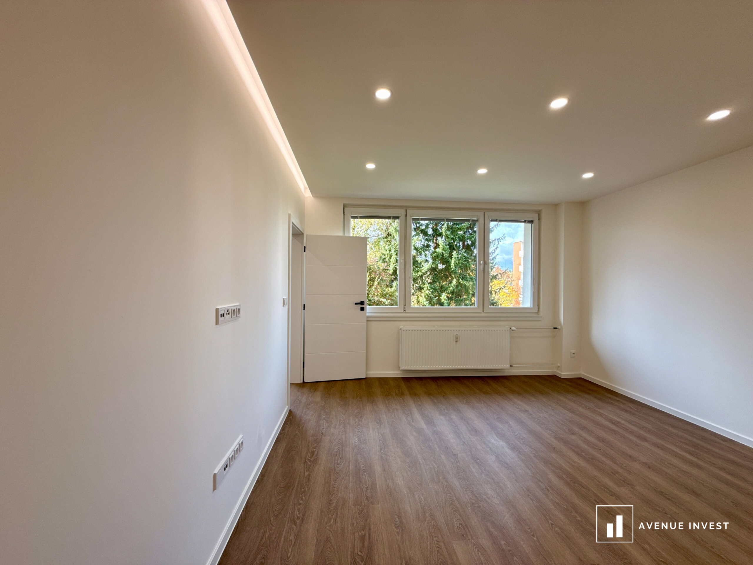 Dispozice zahrnuje obývací pokoj, samostatnou kuchyni, neprůchozí ložnici, koupelnu, oddělené WC a praktickou komoru pro úložný prostor. K bytu náleží také sklep. Velká okna zajišťují dostatek denního světla, díky čemuž byt působí vzdušným a příjemným dojmem.