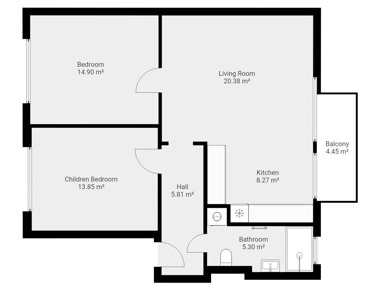 Dispozice bytu nabízí obývací pokoj s kuchyňským koutem, dva neprůchozí pokoje, koupelnu s toaletou, vstupní chodbu s úložnými prostory a již zmíněný prostorný balkon. Díky velkým oknům je byt velmi světlý a působí vzdušně.